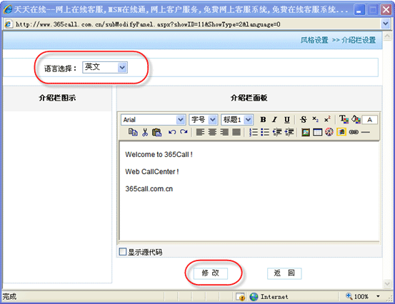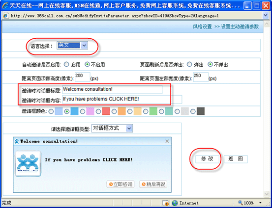 | 再次點擊“系統(tǒng)設(shè)置”->“風格設(shè)置”->“主動邀請設(shè)置”,彈出主動邀請設(shè)置頁,在“語言選擇”選擇要設(shè)置的語言種類,輸入完畢信息后,點擊“修改”按鈕: |