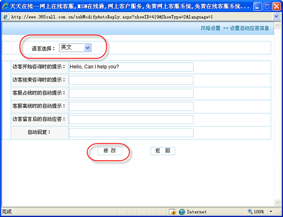 | 再次點擊“系統(tǒng)設(shè)置”->“風格設(shè)置”->“自動應(yīng)答”,彈出自動應(yīng)答信息設(shè)置頁,在“語言選擇”選擇要設(shè)置的語言種類,輸入完畢信息后,點擊“修改”按鈕: |