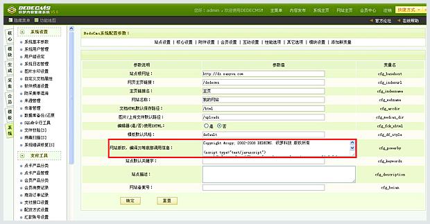 首先獲取在線客服安裝代碼,然后登陸DeDecms后臺,進(jìn)入系統(tǒng)》系統(tǒng)基本參數(shù),復(fù)制在線客服 代碼并粘貼到“網(wǎng)站版權(quán)、編譯JS等底部調(diào)用信息”,點擊確定完成。