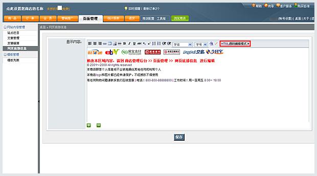 進(jìn)入SHOPEX4.8網(wǎng)站后臺(tái),選擇菜單"頁面管理"->"網(wǎng)站內(nèi)容管理"->"網(wǎng)頁底部信息",然后點(diǎn)擊窗口右上角"HTML源碼編輯模式"按鈕,切換到源代碼界面,將365webcall客服代碼加入到網(wǎng)頁底部信息代碼最后面保存即可。