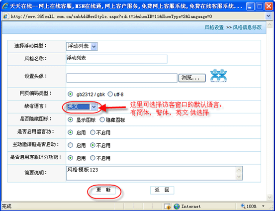 | 再次點擊“系統(tǒng)設(shè)置”->“風格設(shè)置”->“主動邀請設(shè)置”,彈出主動邀請設(shè)置頁,在“語言選擇”選擇要設(shè)置的語言種類,輸入完畢信息后,點擊“修改”按鈕: |