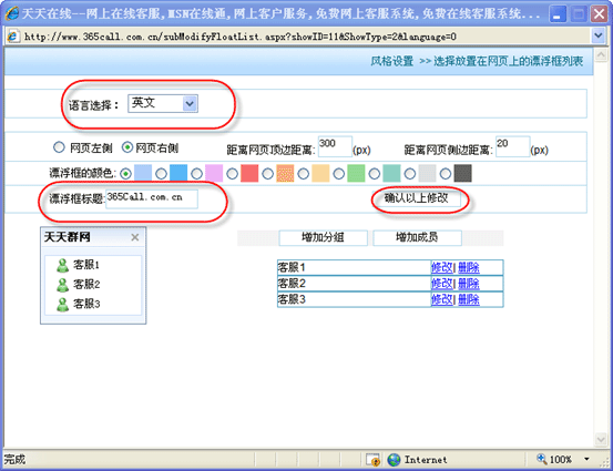然后點擊“系統(tǒng)設(shè)置”->“風格設(shè)置”->“客服圖標設(shè)置”,彈出客服圖標設(shè)置頁,“語言選擇”欄選擇需要設(shè)置的語言,“漂浮框標題”欄輸入需要設(shè)置的該語言的標題,然后點擊“確認以上修改”: |