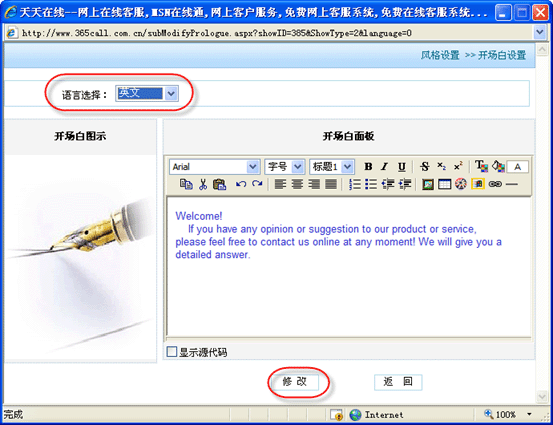 | 再次點擊“系統(tǒng)設(shè)置”->“風格設(shè)置”->“開場白設(shè)置”,彈出開場白設(shè)置頁,在“語言選擇”選擇要設(shè)置的語言種類,輸入完畢信息后,點擊“修改”按鈕: |