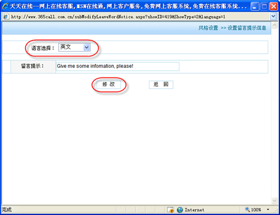 | 再次點擊“系統(tǒng)設(shè)置”->“風格設(shè)置”->“留言設(shè)置”,彈出留言設(shè)置頁,在“語言選擇”選擇要設(shè)置的語言種類,輸入完畢信息后,點擊“修改”按鈕: |