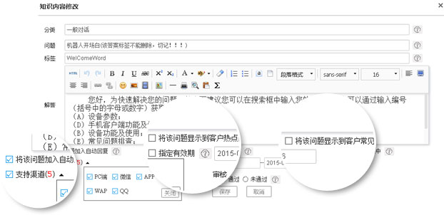 365webcall智能知識庫全媒體接入,統(tǒng)一管理、智能解答、熱點問題、常見問題、人員權限管理。