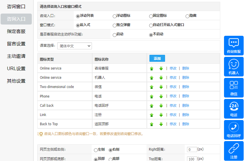 訪客可在客服休息時(shí)間或忙碌未及時(shí)回復(fù)時(shí)將自己的聯(lián)系方式留下,等待客服回呼解決問題,可在“系統(tǒng)設(shè)置-媒體對(duì)接-網(wǎng)頁(網(wǎng)站)-設(shè)置-咨詢?nèi)肟凇?/span>